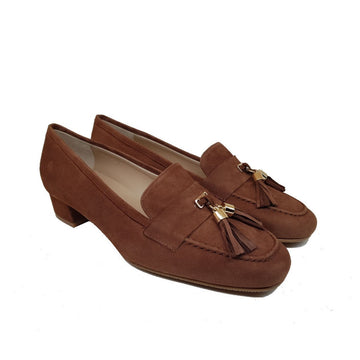 Mocasines de Mujer con Borlas y Punta Cuadrada Redondeada. Material exterior: Piel Ante Marrón Havana....