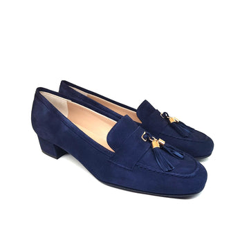 Damenmokassin mit dekorativen Trotteln auf dem Vorderblatt und abgerundeter Karreeform. Obermaterial: marineblaues Veloursleder Innenfutter: Leder...